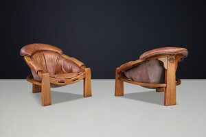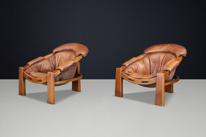 Luciano Frigerio Lounge Chairs in Cognac Leather and Stained Walnut 1970Origin: