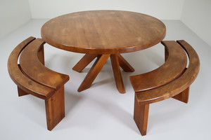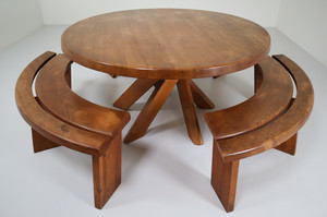 Pierre Chapo Midcentury T21 Sfax Elm Dining Table and Three S38A Benches France 1960sSchool: