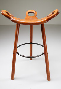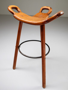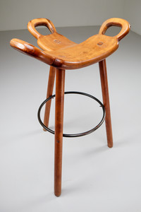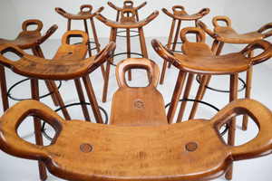 85 cm (33.46 inch)Nine blond Brutalist "Marbella" bar stools by Confonorm, Spain, 1970, three-legged stools in dark stained oak with circular metal footrests, the T-shaped seat features three handles. Well made, sturdy and durable pieces, highly suitable for both residential bars and public places. Amazing original blond patina.