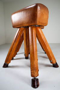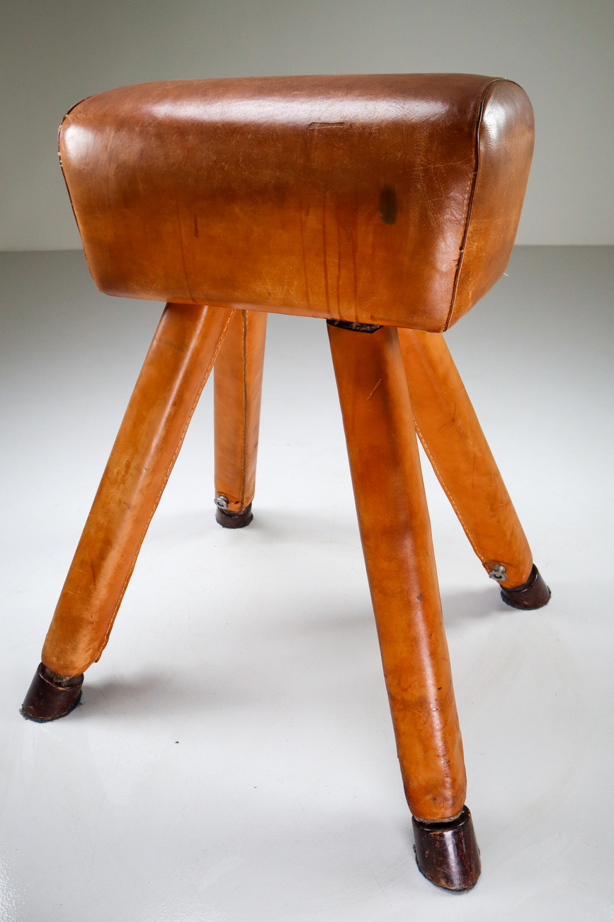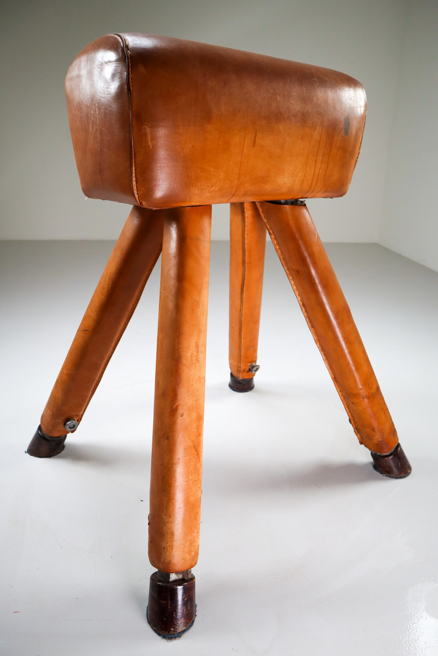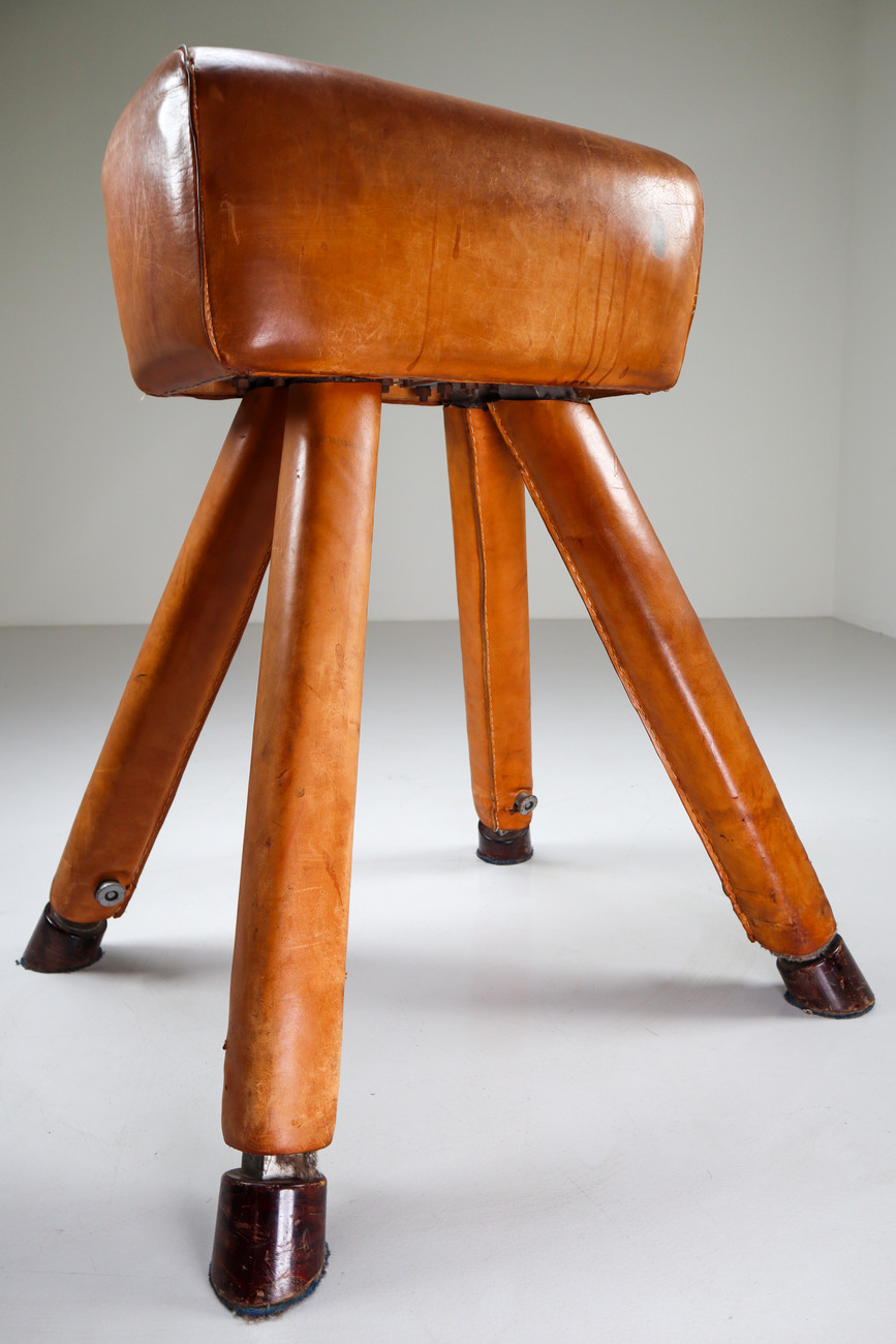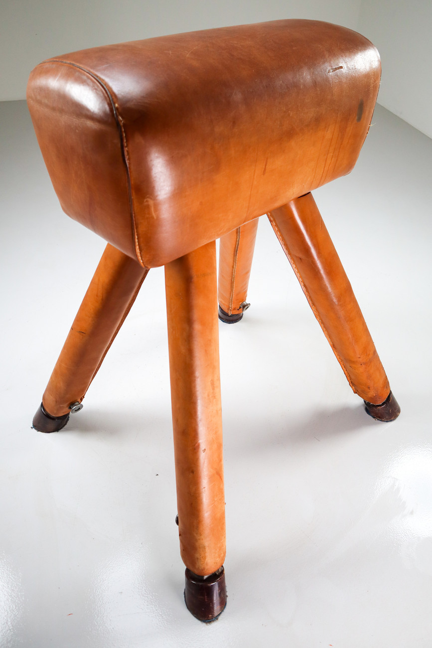 115 cm (45.28 inch)Patinated cognac leather covered beechwood gym horse, circa 1950. Salvaged from an old gym, this handsome piece of equipment is weighted for stability and has horse shaped hoof feet. Lots of patina, imperfections and overall charm and amazing good condition.