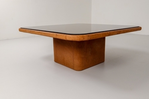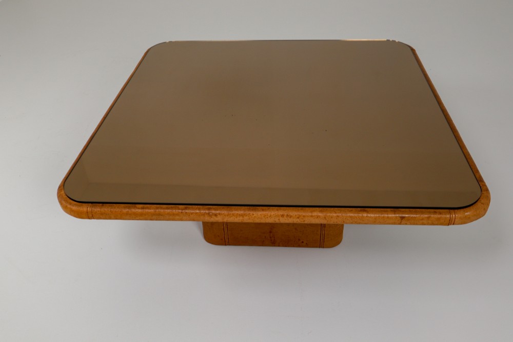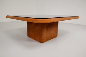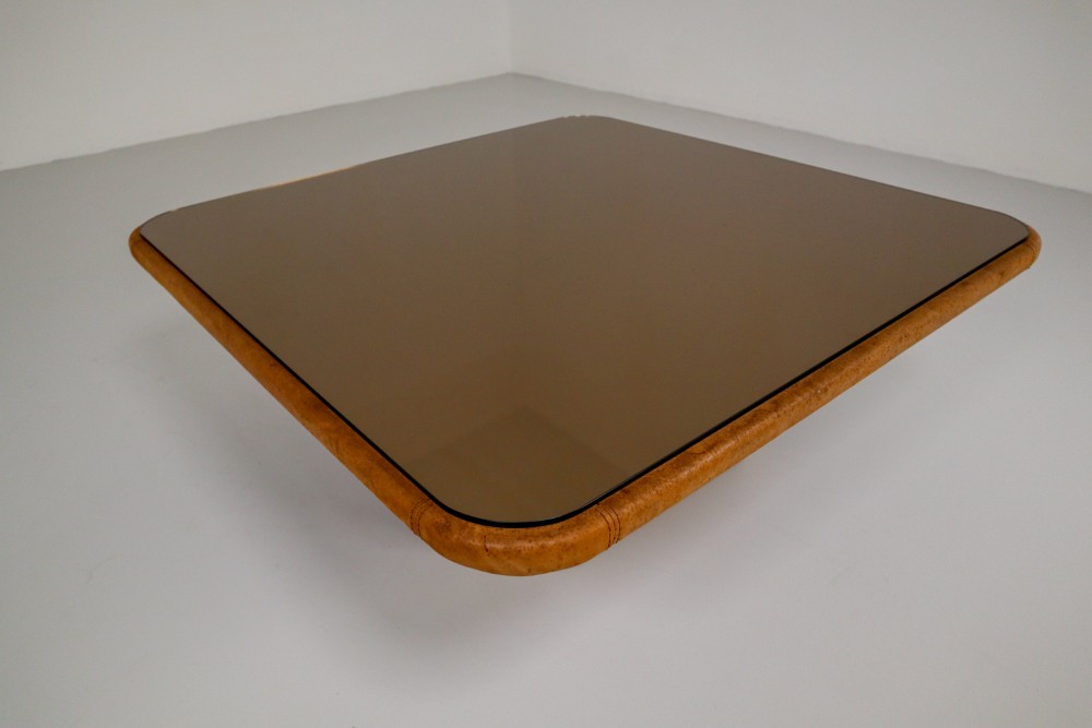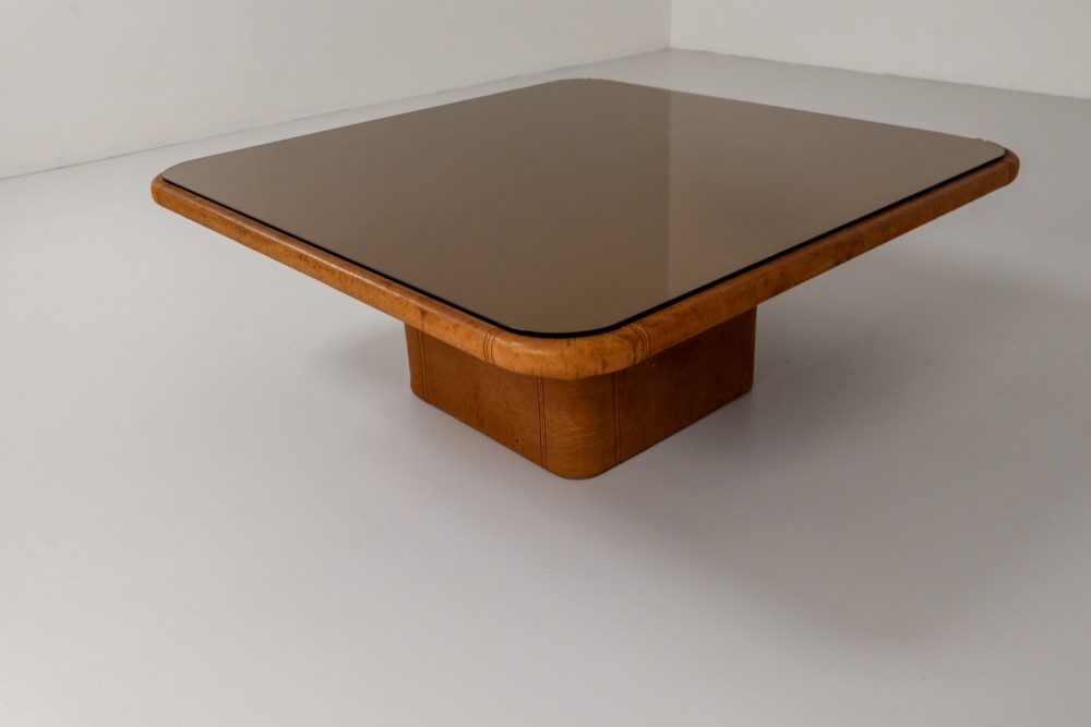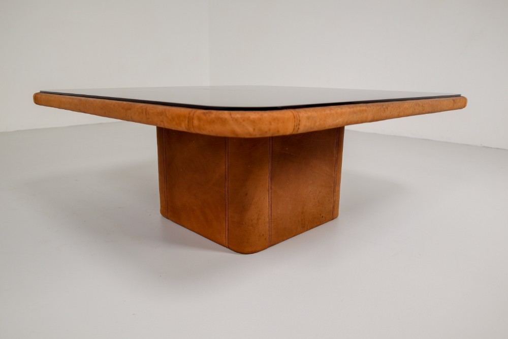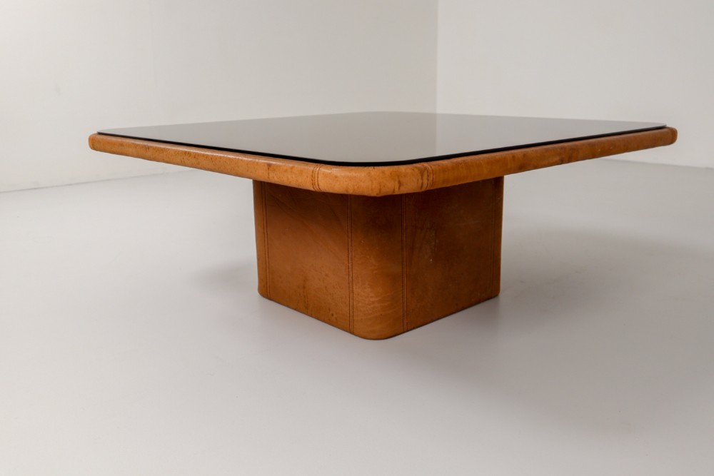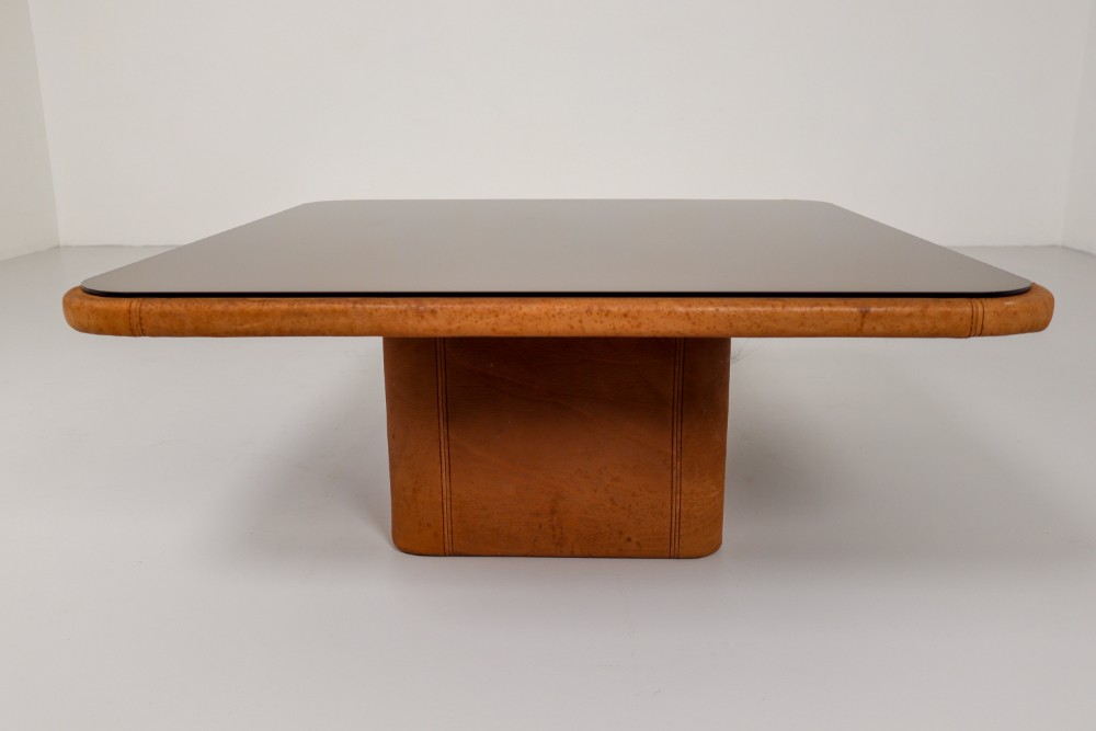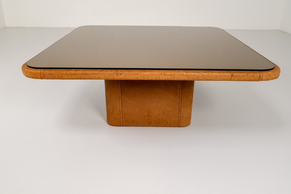 De Sede square coffee table "DS-47" design 1970, made of the highest quality buffalo leather in a unique patinated cognac color leather and black lacquered glass plate mirror effect. Remains in excellent and original condition. The leather and construction are very good vintage shape, making this table an absolutely incredible find with a wonderful patina!. De Sede has its origins in a small but skilled saddler's workshop in Klingnau, Switzerland. The craftsmen there committed themselves to transforming the best possible leather into seating furniture. Their years of experience and diligence enabled them to create handcrafted leather furniture of singular quality. In 1965, the family-run business became a joint-stock company called De Sede AG, but remained faithful to their original guiding principles. The company developed rapidly from this moment onwards: top designers of international caliber were brought on board to create seating furniture, additional manufacturing facilities were opened, and an international distribution network was established. Sophisticated designs that skillfully integrate traditional and precise Swiss workmanship swiftly gained the brand an international reputation. Today, De Sede AG presents itself as a leading manufacturer of exclusive leather furniture. Out of the original small workshop, a company has emerged that employs over 140 people and distributes furniture in more than 40 countries, including the United States and Russia, the Arab world, and even emerging markets such as China and Brazil. De Sede AG has been owned by a Swiss investment group since 2012.
