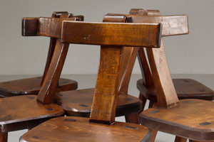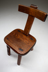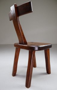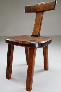 46 cm (18.11 inch)Six sculptural chairs designed by Olavi Hanninen and manufactured by Mikko Nupponen. These chairs made of stained elm wood and sculpturally crafted by hand very minimalistic, yet brutalistic shaped and in very good original condition. The Finnish designer and interior architect Olavi Hänninen (1920-1992) designed everything from furniture to trams, public facilities to church decorations. His designs range from rustic pieces to ones with a Space Age aesthetic. In 1957 Hänninen received the gold medal at the 11th Milan Triennale.