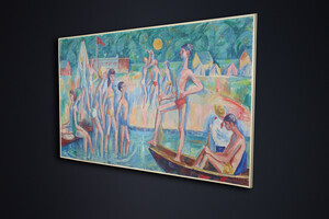 Large Modernist Oil Painting ‘Bathing Scene’ Signed Urbanek, 1963 Mid-20th century